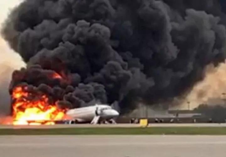 Al menos 40 de los 78 ocupantes del avión Sukhoi Superjet-100 que se incendió ayer domingo en la ciudad de Moscú, Rusia, murieron después de que el aparato tuviera que aterrizar de emergencia. EFE.