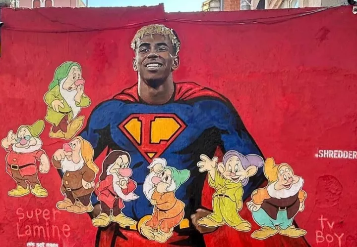 La obra de TVBoy retrata a Lamine Yamal como un superhéroe, vestido como tal y con una 'L' en el pecho a modo de homenaje tanto por su mayoría de edad como por su meteórica carrera. Según parece, la modificación ha sido realizada por Shredder, otro artista urbano que dejó su firma en la obra de TVBoy.