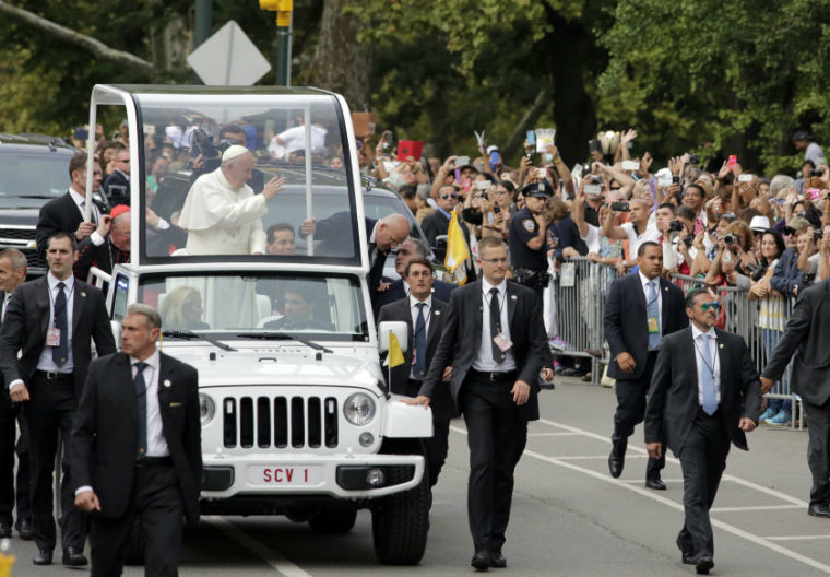Francisco llegó a la Basílica de Santos Pedro y Pablo el sábado por la mañana en su Fiat negro. Lo recibieron el gobernador de Pennsylvania, Tom Corbett, y su esposa.