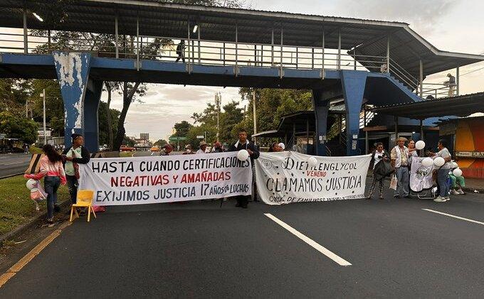 Familiares y pacientes afectados con el jarabe envenenado con dietilenglicol mantienen cerrada la vía Transístmica para exigirle al Gobierno mayor atención y respuestas a sus demandas, cuando se cumple 17 años desde que se reveló esta contaminación en el producto que distribuyó la Caja de Seguro Social.