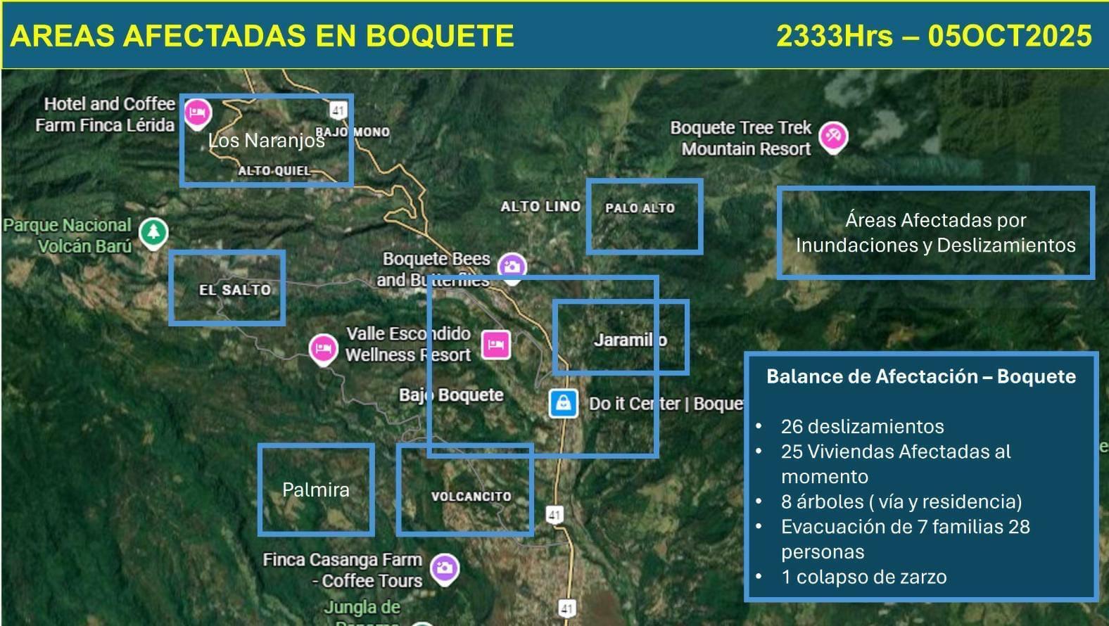 El Centro de Operaciones de Emergencias (COE) informó que en las últimas 12 horas se han registrado múltiples afectaciones en el distrito de Boquete, provincia de Chiriquí, como consecuencia de las lluvias intensas y el desbordamiento de quebradas cercanas al río Caldera.