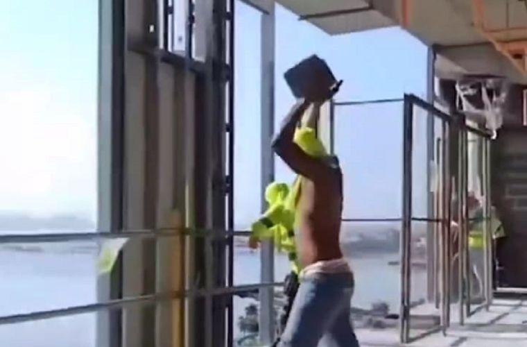 Los obreros se atrincheraron en una torre en construcción del hospital y desde lo alto lanzaron bloques, tornillos y barras de acero. Los propios obreros filmaron a un compañero lanzando bloques al vacío y en medio de carcajadas gritaban: ¡crimen!
