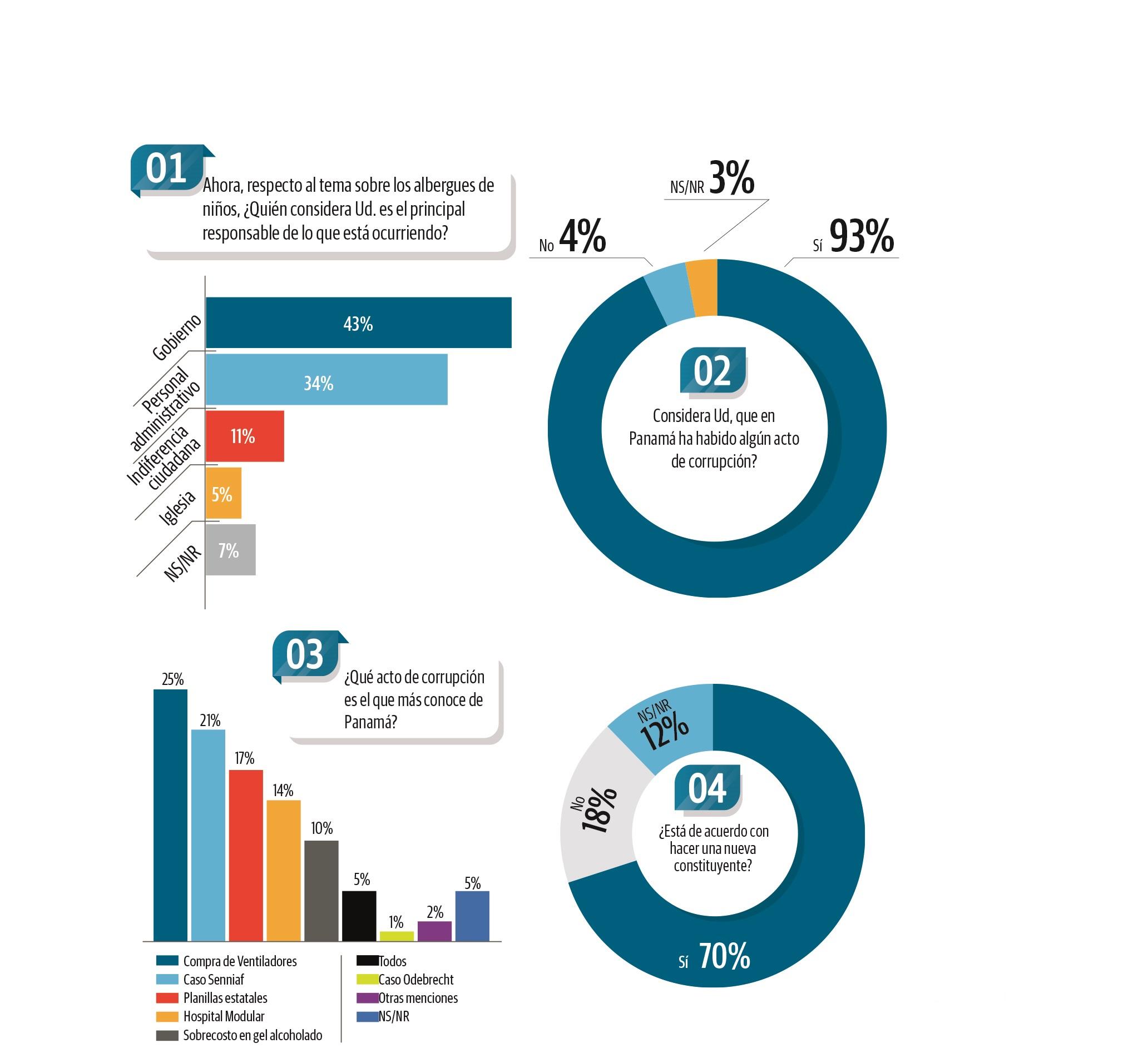 Pero, ¿cuáles son esos actos de corrupción que más conoce el panameño? La lista la encabeza la compra de ventiladores con 25%, el caso de los abusos de menores en albergues con un 21%, las planillas estatales con 17%.