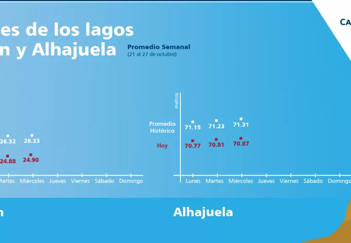 El nivel del embalse de Alajuela amaneció este miércoles en 70.87 metros, mientras que el de Gatún alcanzó 24.90 metros, ambos inferiores a sus promedios históricos para esta fecha de 71.31 y 26.33 metros, respectivamente.