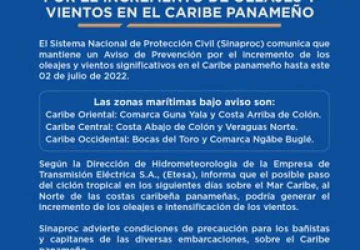 El Sistema Nacional de Protección Civil emitió un aviso de prevención por el incremento del oleaje y vientos en el Caribe panameño hasta el proximo sábado 2 de julio de 2022.