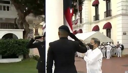 El Mandatario izó el pabellón nacional en la parte exterior del palacio presidencial , luego se cantó el Himno Nacional interpretado musicalmente por la Banda Repúblicana.