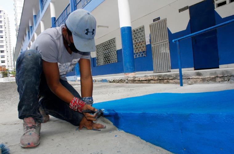 Mientras que, en el Centro Educativo Luis N. Herazo, se trabaja en la reparación de la tubería de agua potable, pintura de la fachada, colocación de láminas de cielo raso y reparación e instalación de marquesina.