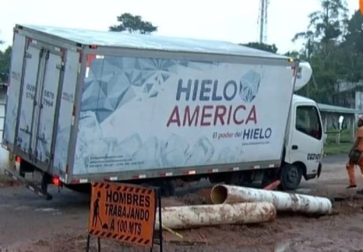Un camión de reparto quedó atascado en el área por el colapsó la tubería.