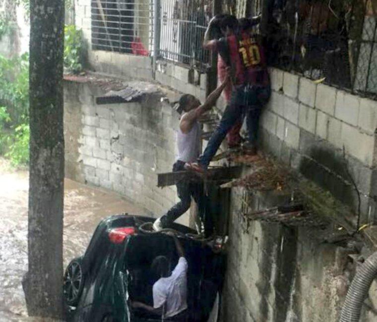 Un auto fue arrastrado por la corriente a la altura de La Gran Estación a una quebrada y sus tres ocupantes fueron rescatados, luego en calle 22, Pueblo Nuevo.