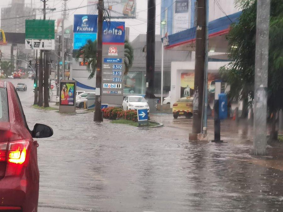 La fuerte lluvia que cae sobre la ciudad capital y otros puntos del país ha dejado varias calles anegadas por lo que se solicita a los conductores manejar con precacución.
