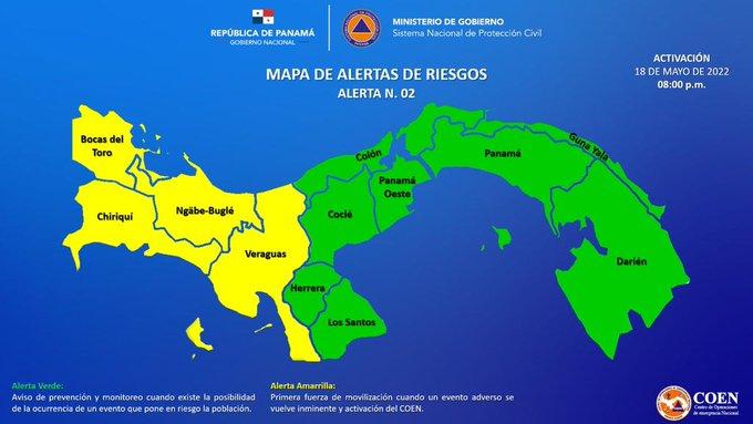 Panamá- El Sistema Nacional de Protección Civil (Sinaproc) declaró alerta amarilla por incremento de lluvias en Bocas del Toro, Chiriquí, Veraguas y comarca Ngäbe Buglé.