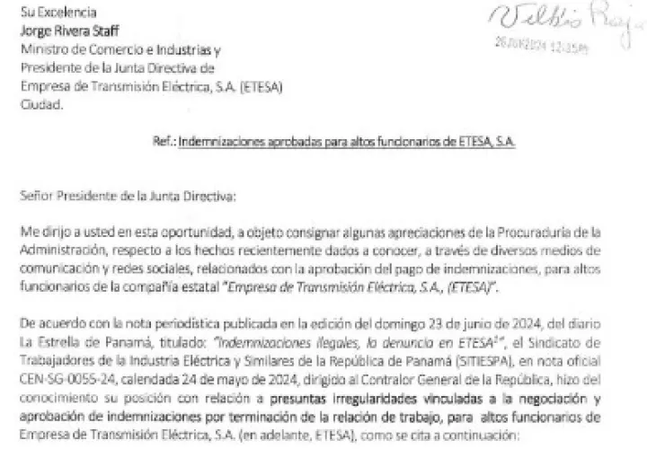 El Procurador de la Administración, Rigoberto González, aclaró sobre el régimen laboral de los altos directivos de Etesa, en una nota dirigida al Ministro de Comercio e Industrias y presidente de la junta directiva de de la entidad, Jorge Rivera Staff,