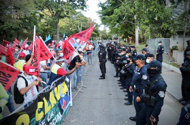 Mientras se instalaba el diálogo, delegaciones de organizaciones populares realizaron una protesta en los predios del Parlatino. En las calles se defenderá al Seguro. No más diálogos de Yo con Yo. Gobierno y empresarios corruptos que deben cientos de millones, hecho negociados y han saqueado al Seguro quieren decidir todo, destacó el Suntracs.
