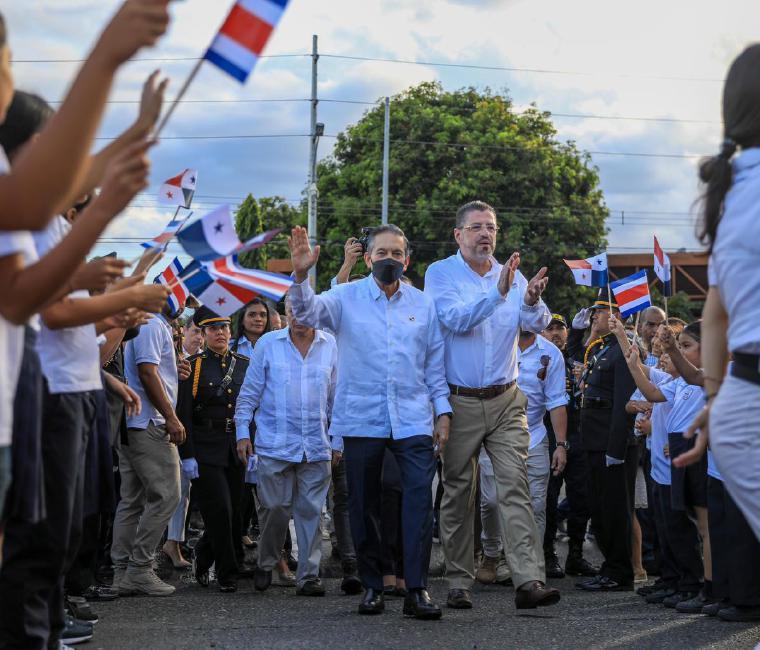 Chaves recibió al mandatario panameño en el puesto fronterizo y recorrieron juntos las instalaciones escoltados con notas musicales de la banda municipal de Zarcero, banda que representó a Costa Rica en el Desfiles de Las Rosas en Estados Unidos.