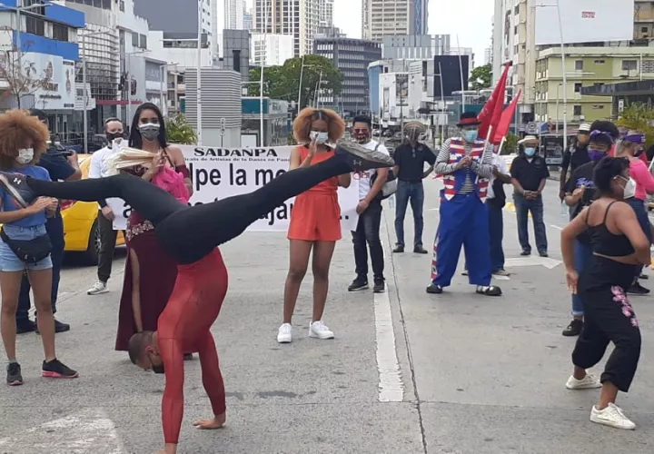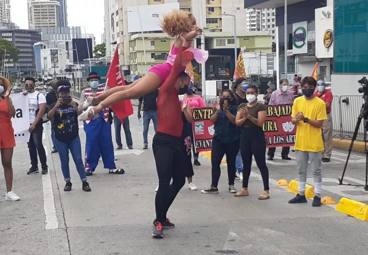 Bailarines y otros grupos artísticos protestaron hoy en la vía España, porque se han quedado sin escenario e ingresos a causa de la pandemia de Covid-19.
