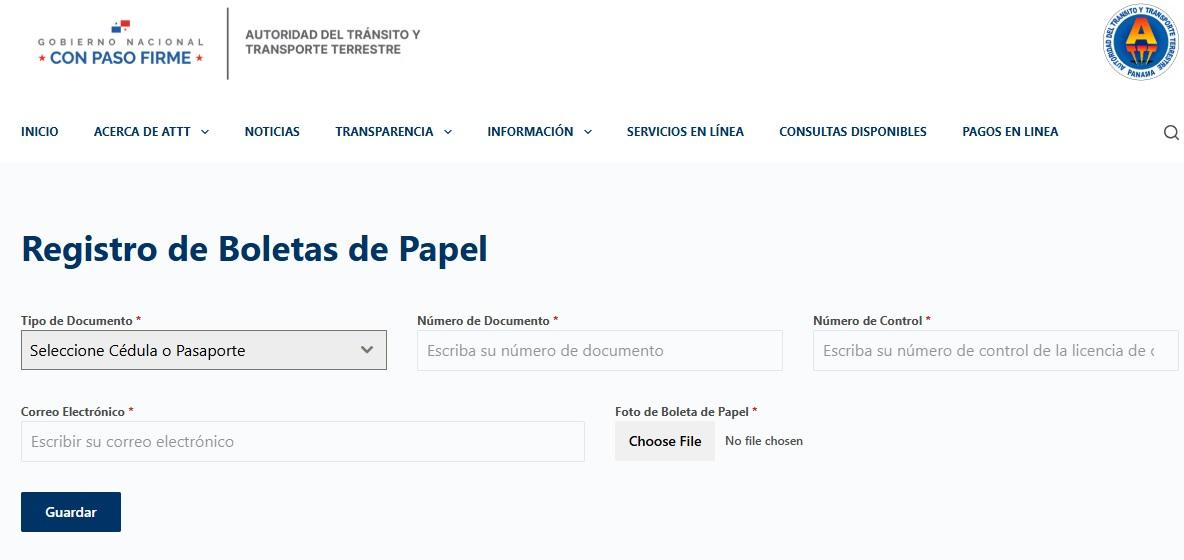 Ahora, cualquier ciudadano puede registrar su boleta de papel desde la comodidad de su casa. Solo debe ingresar al portal www.transito.gob.pa, entrar a la opción “Servicios en Línea”, seleccionar “Registro de Boletas en Papel” y llenar los datos requeridos: tipo y número de documento, número de control, correo electrónico y una foto o escaneo de la boleta.