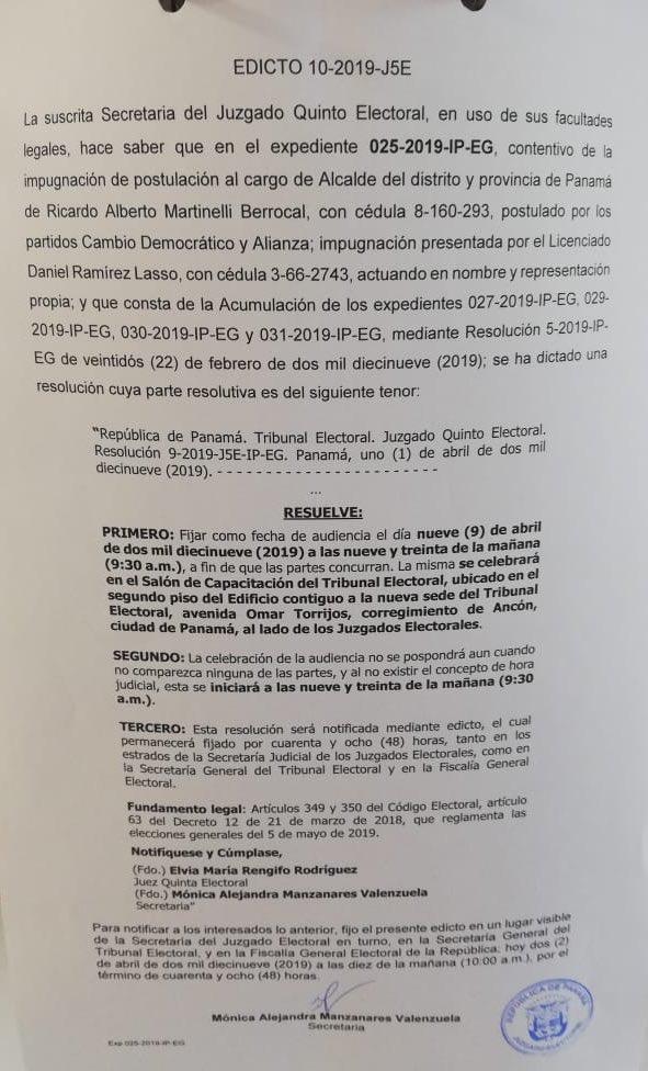 El edicto, solo resuelve en la impugnación de postulación al cargo de Alcalde del distrito de Panamá, y no la de su candidatura a diputado por el circuito 8-8.