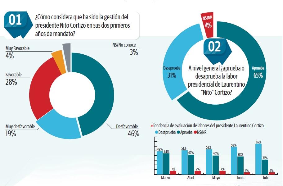 En la encuesta, el 46% la evaluó de desfavorable y el 19% de muy desfavorable. Solo un 28% dijo que la gestión de Cortizo es favorable y un 4% de muy favorable. Un 3% dijo no saber, en la medición de Gallup de Panamá.