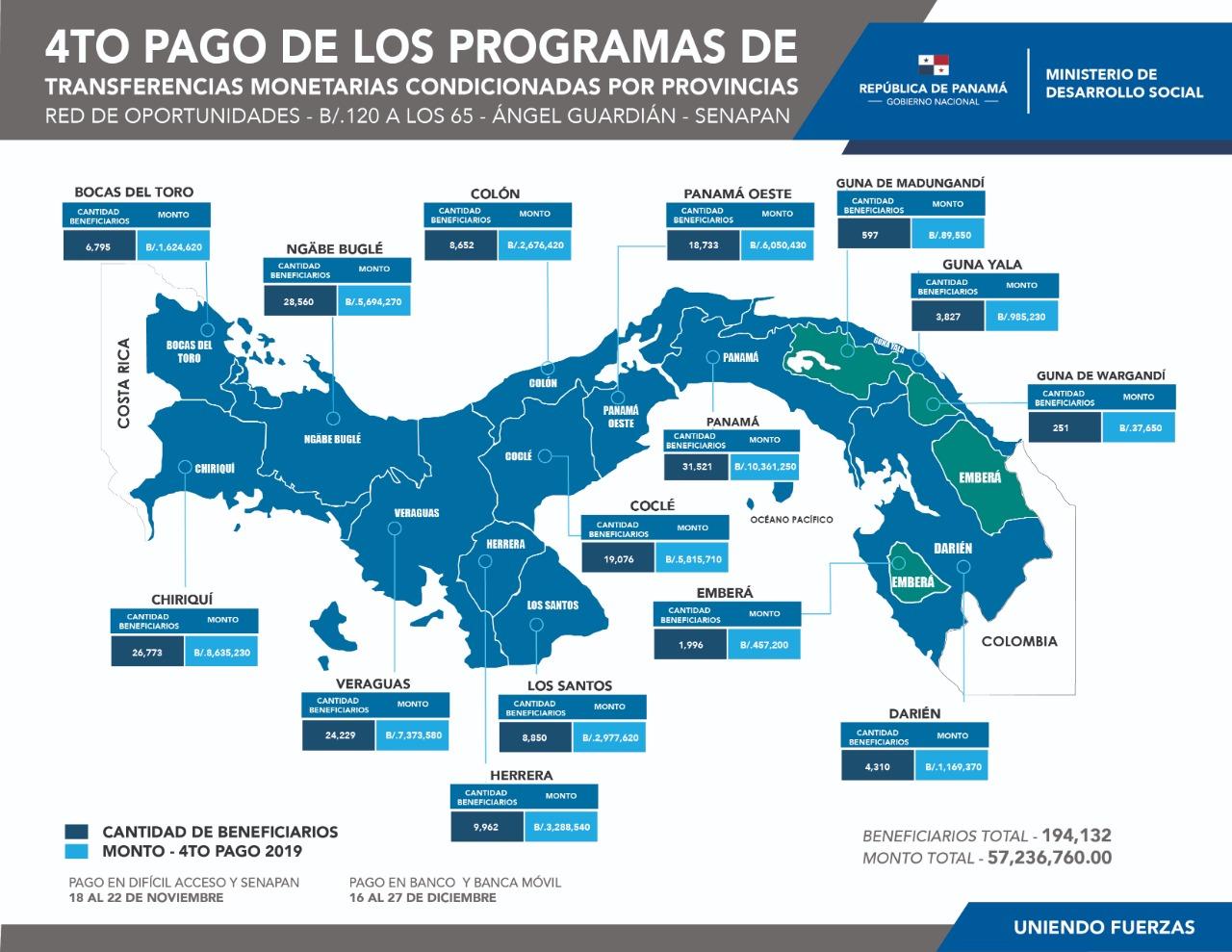 El Programa B/.120.00 a los 65, beneficia a 125 mil beneficiarios con un monto de $45.2 millones; Red de Oportunidades impacta a 40 mil 814 con un desembolso de $6.1 millones; Ángel Guardián, benefician a otros 19 mil 254 con un monto de $4.6 millones y el Bono Alimenticio de SENAPAN, favorece a 8 mil 495 personas con un desembolso de $1.2 millones.