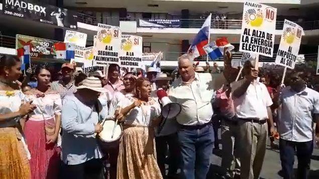 Panamá- Un grupo de avicultores y civiles protestan al ritmo de un alegre tamborito y murga contra el incremento de la luz.