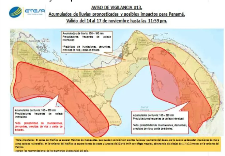 Destaca que la empresa de transmisión eléctrica Etesa que prevé acumulados significativos de lluvias desde hoy, sábado, hasta el martes 17 de noviembre, intensificación del viento del oeste y suroeste en horas de la tarde.