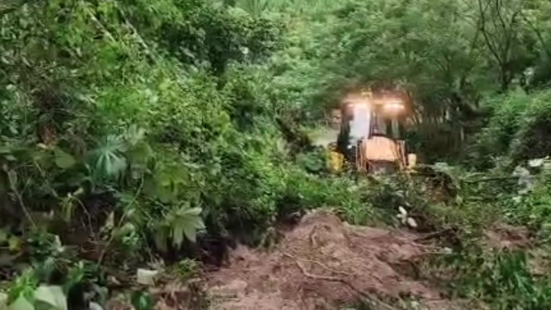 Con ayuda de una retroexcavadora se está removiendo el lodo y roca que se encuentran sobre la carretera.