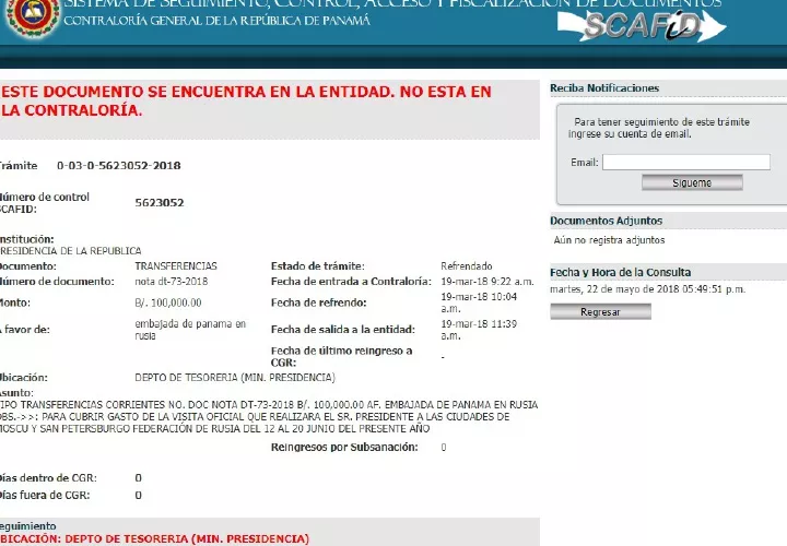 En la página de la Contraloría, en su sección de Sistema de Seguimiento, Control, Acceso y Fiscalización de Documentos, posteó con número de control 5623052 el trámite que ha gestionado el Ministerio de la Presidencia para sufragar los gastos de la visita del mandatario a Rusia.