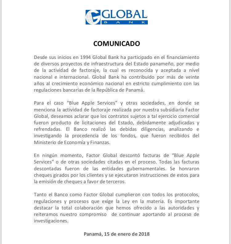 "Para el caso 'Blue Apple Services' y otras sociedades, en donde se menciona la actividad del factoraje realizada por nuestra subsidiaria Factor Global, deseamos aclara que los contratos sujetos a tal ejercicio comercial fueron producto de licitaciones del Estado debidamente adjudicadas y refrendadas", indicó Global Bank.