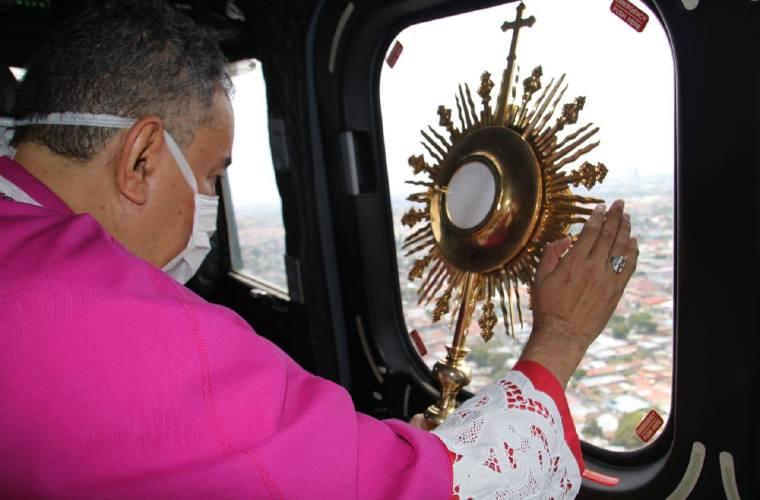 El arzobispo de Panamá, José Domingo Ulloa, sobrevoló en helicóptero junto a la imagen de Santa María la Antigua para bendecir a Panamá.
