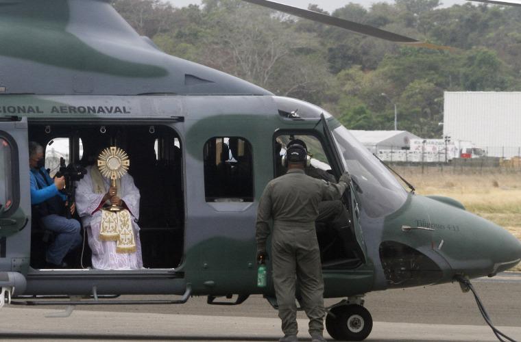Luego de que monseñor Ulloa saliera de la Catedral junto al Santísimo Sacramento, partió desde el aeropuerto Panamá Pacifico, en Howard, Arraiján, en un helicóptero del Senan.