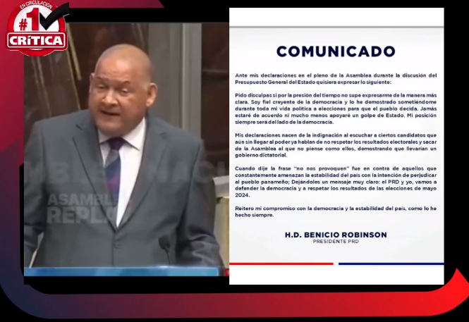 El presidente del PRD, Benicio Robinson, se disculpó tras prender el rancho y referirse a un posible Golpe de Estado.