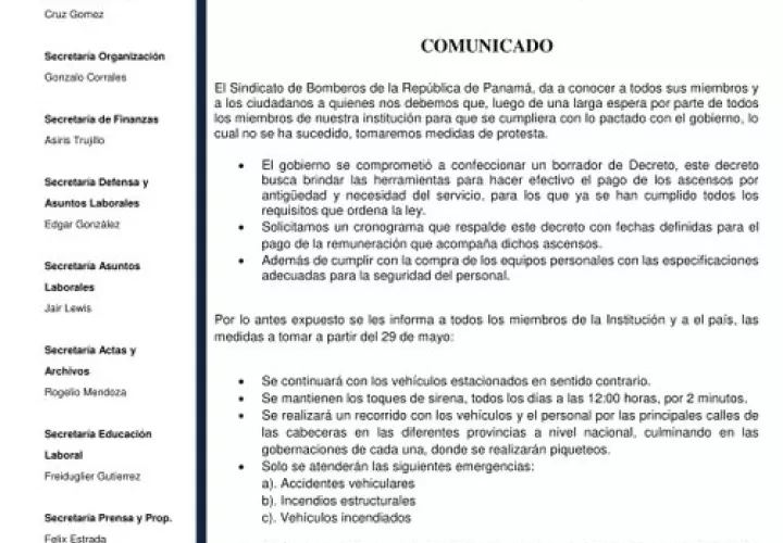 El Sindicato de Bomberos de la República de Panamá ha advertido que estas nuevas acciones y las anteriores se mantendrán hasta que el ministerio de Gobierno logré la firma de Decreto Ejecutivo y se establezca un cronograma de fechas para hacer efectivo el pago de los camisas rojas" ascendidos", que suman un total de más $2 millones.