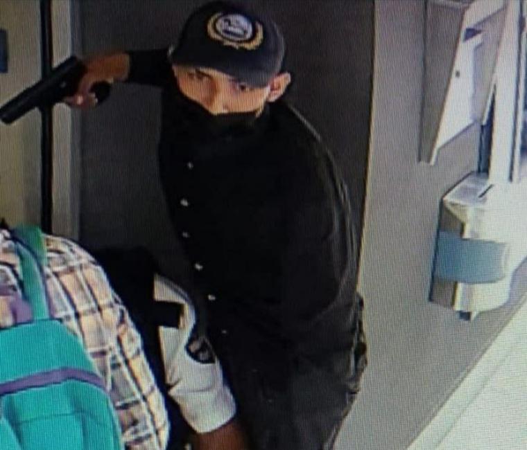 Imágenes de las cámaras de seguridad muestran a uno de los asaltantes vestido de negro y con gorra, al que solo se le pueden ver los ojos, sometiendo al seguridad y apuntándole en la cabeza con una pistola. Se ve también en la misma imagen a otro asaltante con camisa a cuadros, pero de espaldas, vistiendo una mochila verde con morado.