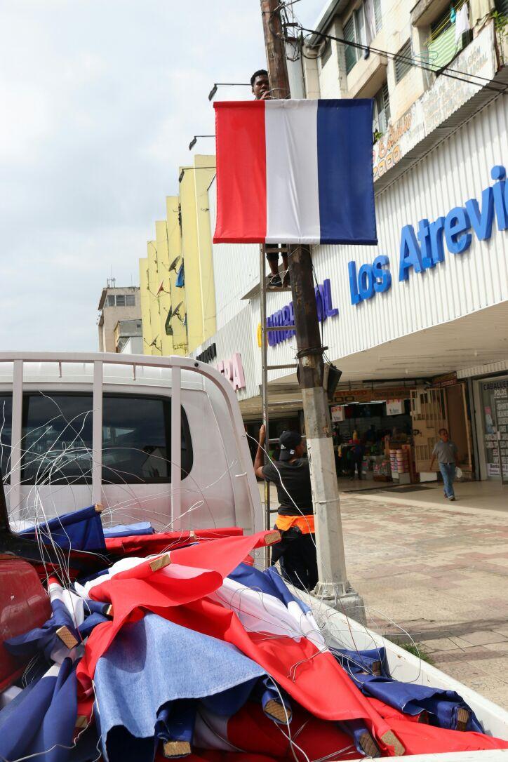 Funcionarios de la Junta Comunal de Calidonia realizaron hoy la colocación de banderolas tricolor a lo largo del corregimiento , a fin de crear el ambiente festivo patriótico.