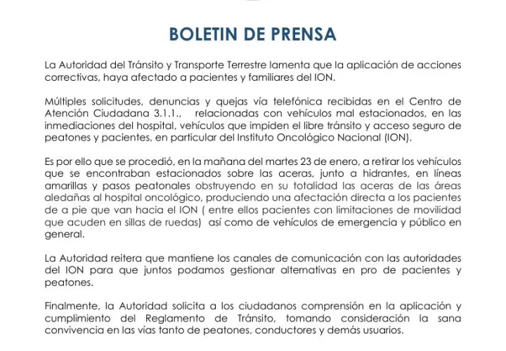 Familiares de pacientes del Instituto Oncológico Nacional se encuentran molestos, ya que varios vehículos fueron removidos con grúa en un operativo desarrollado ayer, martes, por funcionarios de la Autoridad de Tránsito y Transporte Terrestre (ATTT).