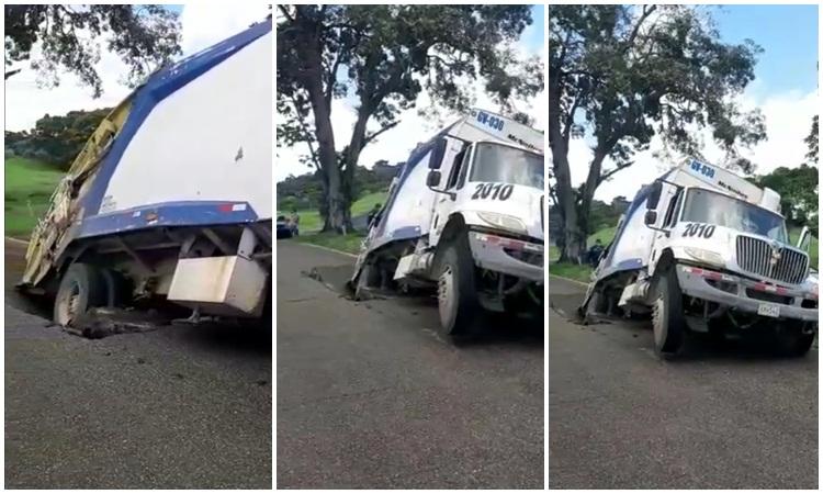 En los precisos momentos, en que pasaba un carro recolector, con la numeración 2010, la calle cedió y quedó atrapado en la vía, con las ruedas traseras, en el desnivel.