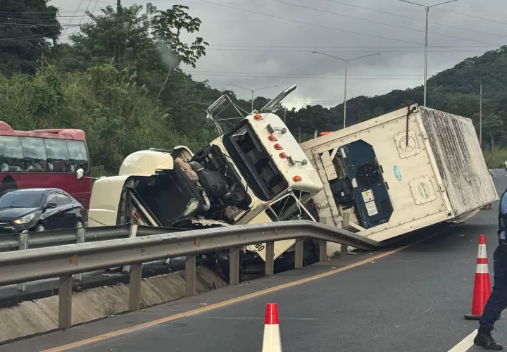 Un vehículo articulado que transportaba alimentos secos perdió el control y cayó en la cuneta central que divide los cuatro paños de la vía, en dirección hacia el interior del país, a la altura de Loma Brígida, en La Chorrera.