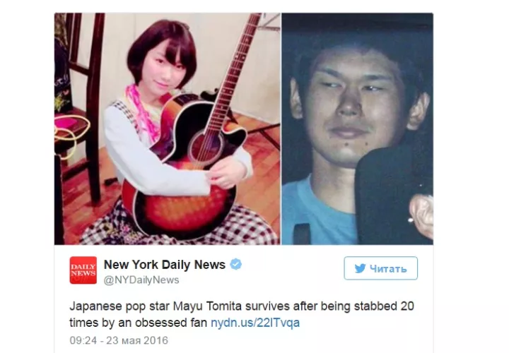 La cantante japonesa Mayu Tomita, de 20 años, fue apuñalada más de 20 veces por un seguidor el 21 de mayo en Tokio, informa el periódico 'The Japan Times'. La víctima fue ingresada en un hospital tras recibir graves heridas en el cuello y pecho y todavía no ha recuperado la consciencia.