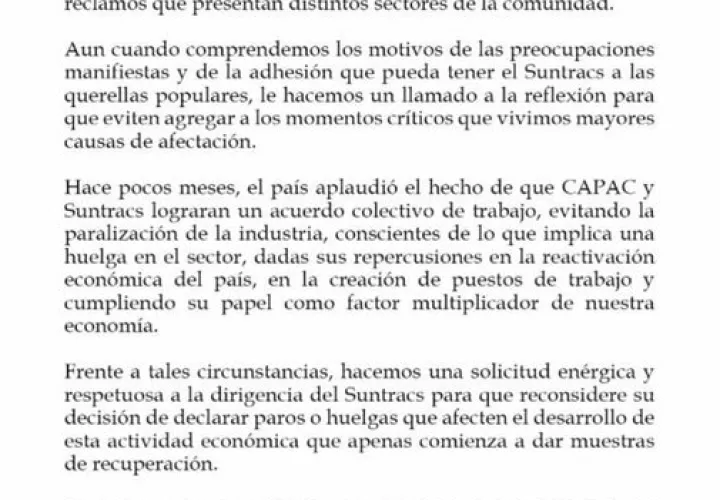 La junta directiva de Capac hace una solicitud enérgica y respetuosa a la dirigencia del Suntracs para que reconsidere su decisión de declarar paros o huelgas que afecten el desarrollo de esta actividad económica que apenas comienza a dar muestras de recuperación.