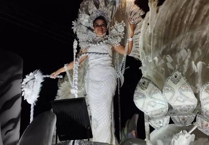 Calle Arriba de Pedasí con su majestad Zulay Escobar se lució en el primer día de Carnaval con un carro monocromático en color blanco.