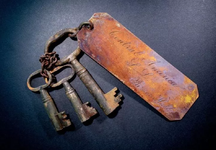 Un postor ganador pagó $102,300 por una histórica etiqueta con el nombre de latón y las llaves recuperadas.