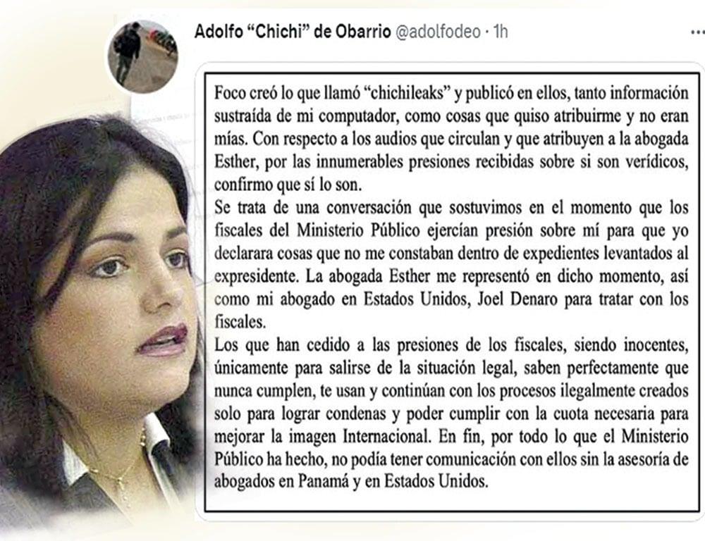 "Foco creó lo que llamó "chichileaks" y publicó, tanto información sustraída de mi computador como cosas que quiso atribuirme y no eran mías. Con respecto a los audios que circulan y que atribuyen a la abogada Esther, por las innumerables presiones recibidas sobre si son verídicos, confirmó que sí lo son", publicó de Obarrio en la cuenta de Twitter, @adolfodeo.