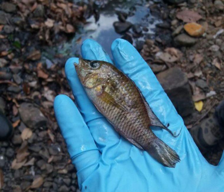 La razón de esta inspección es por el reporte de gran cantidad de peces muertos, debido a un derrame de combustible en el río.