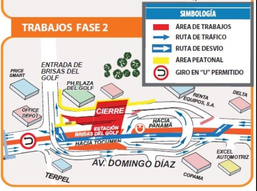Fase 1 – Jueves 21 de junio: Cierre de los tres carriles que dirigen hacia Tocumen y el puente vehicular de salida de Brisas del Golf. Se realizará inversión de carriles en las vías que conducen hacia Panamá Centro (un carril hacia Tocumen y un carril hacia el centro de la ciudad). (Área cerrada en rojo) .