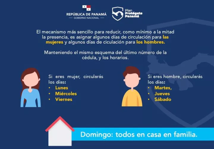 Solo cambian los días en los que se podrán movilizar los panameños de acuerdo al sexo. De esta forma, las mujeres podrán transitar los lunes, miércoles y viernes; mientras que los varones lo harán martes, jueves y sábados. Los domingos, todos se quedarán en casa.