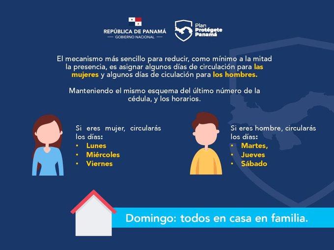 Solo cambian los días en los que se podrán movilizar los panameños de acuerdo al sexo. De esta forma, las mujeres podrán transitar los lunes, miércoles y viernes; mientras que los varones lo harán martes, jueves y sábados. Los domingos, todos se quedarán en casa.