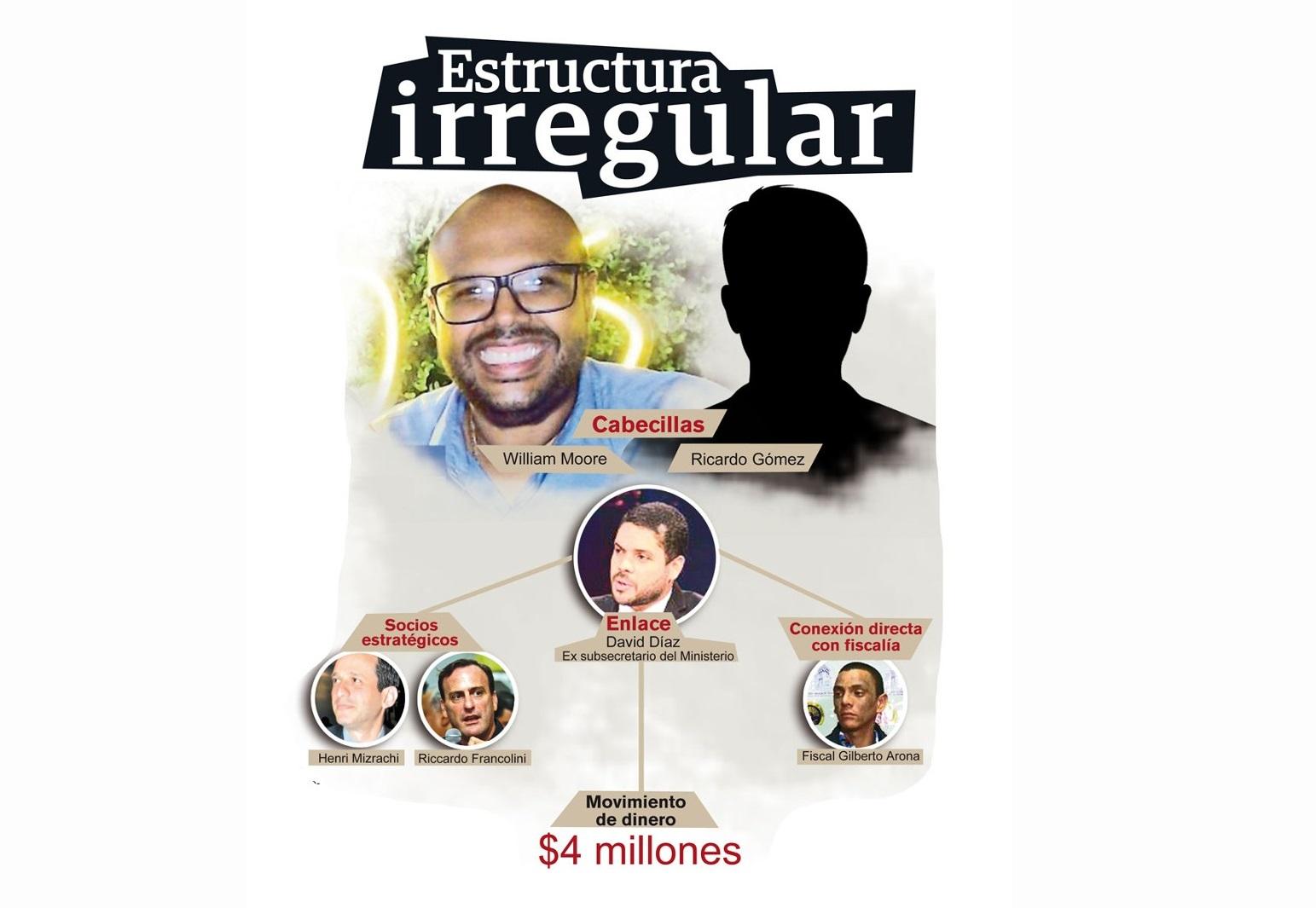 Esta estructura irregular, que penetró al Ministerio Público, tomó forma en agosto de 2020 cuando Francolini convenció a Mizrachi de establecer contactos con el abogado William Moore, por recomendación implícita de otro abogado, David Díaz, el antiguo subsecretario general de la Procuradora, Kenia Porcell.
