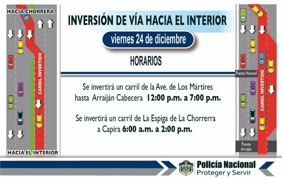 Viernes 24 y 31 de diciembre hacia el interior, de 11:00 a.m. a 7:30 p.m., desde la Ave. de Los Mártires hasta Arraiján Cabecera. Desde la Espiga de La Chorrera hasta Capira (Quesos Chela), dependiendo el flujo vehicular.