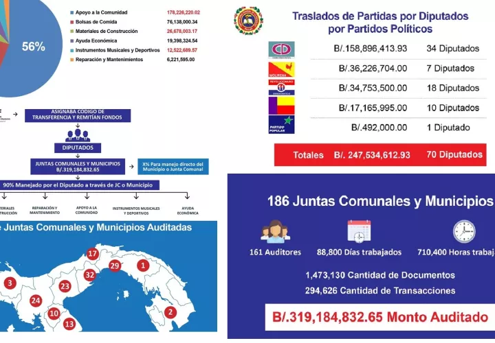 El contralor detalló que B/.178 millones fueron suspuestamente utilizados en apoyo a la comunidad, B/. 76 millones en bolsas de comida, B/.26 millones en materiales de construcción, B/.19,398,324.54 en ayuda económica, 12 millones en instrumentos musicales y $6 millones en reparación y mantenimiento.