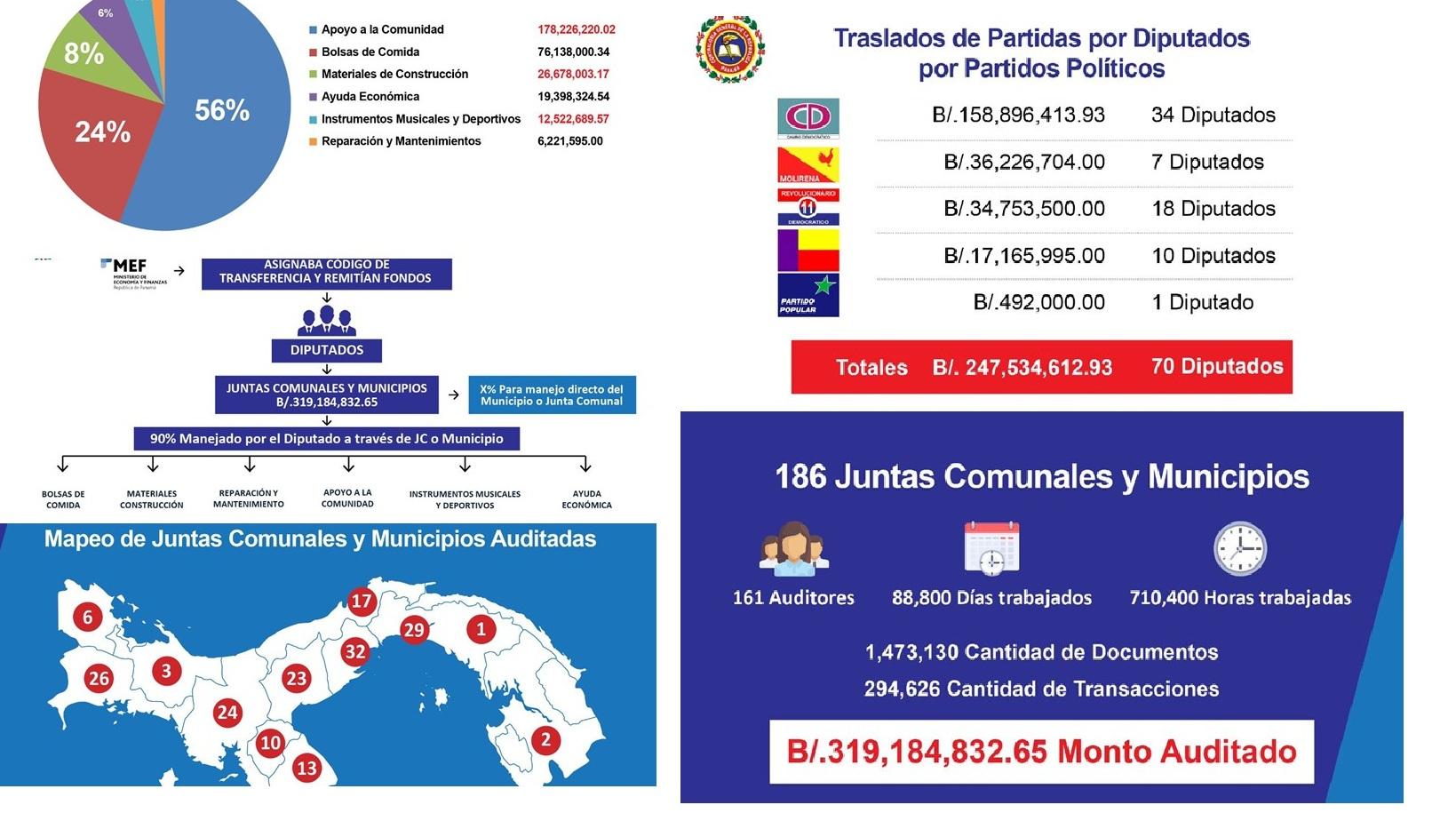 El contralor detalló que B/.178 millones fueron suspuestamente utilizados en apoyo a la comunidad, B/. 76 millones en bolsas de comida, B/.26 millones en materiales de construcción, B/.19,398,324.54 en ayuda económica, 12 millones en instrumentos musicales y $6 millones en reparación y mantenimiento.